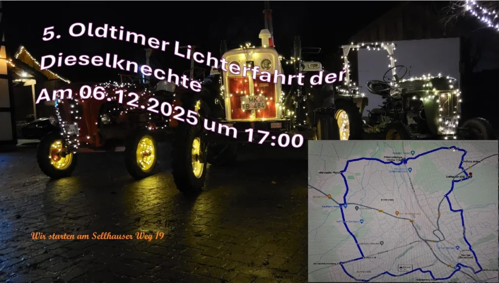 Am 06.12.2025 findet in Menden(Sauerland) die 5. Oldtimer Lichterfahrt der Dieselknechte statt. Auch dieses Jahr werden wir wieder an dieser Lichterfahrt teilnehmen.